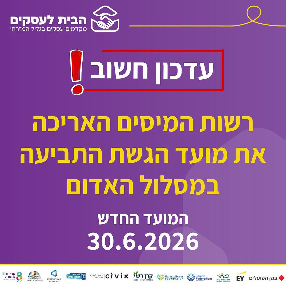 שימו לב: המועד האחרון להגשת תביעות לנזק עקיף במסלול האדום הוארך עד לתאריך 30.6.2026 , בעקבות השלכות מבצע "שאגת הארי" על פעילות העסקים.אלו שקיבלו מקדמות חייבים להגיש את הדו״ח המסכם, אחרת יידרשו להחזיר את כל הסכומים שקיבלו מתחילת המלחמה ועד היום.